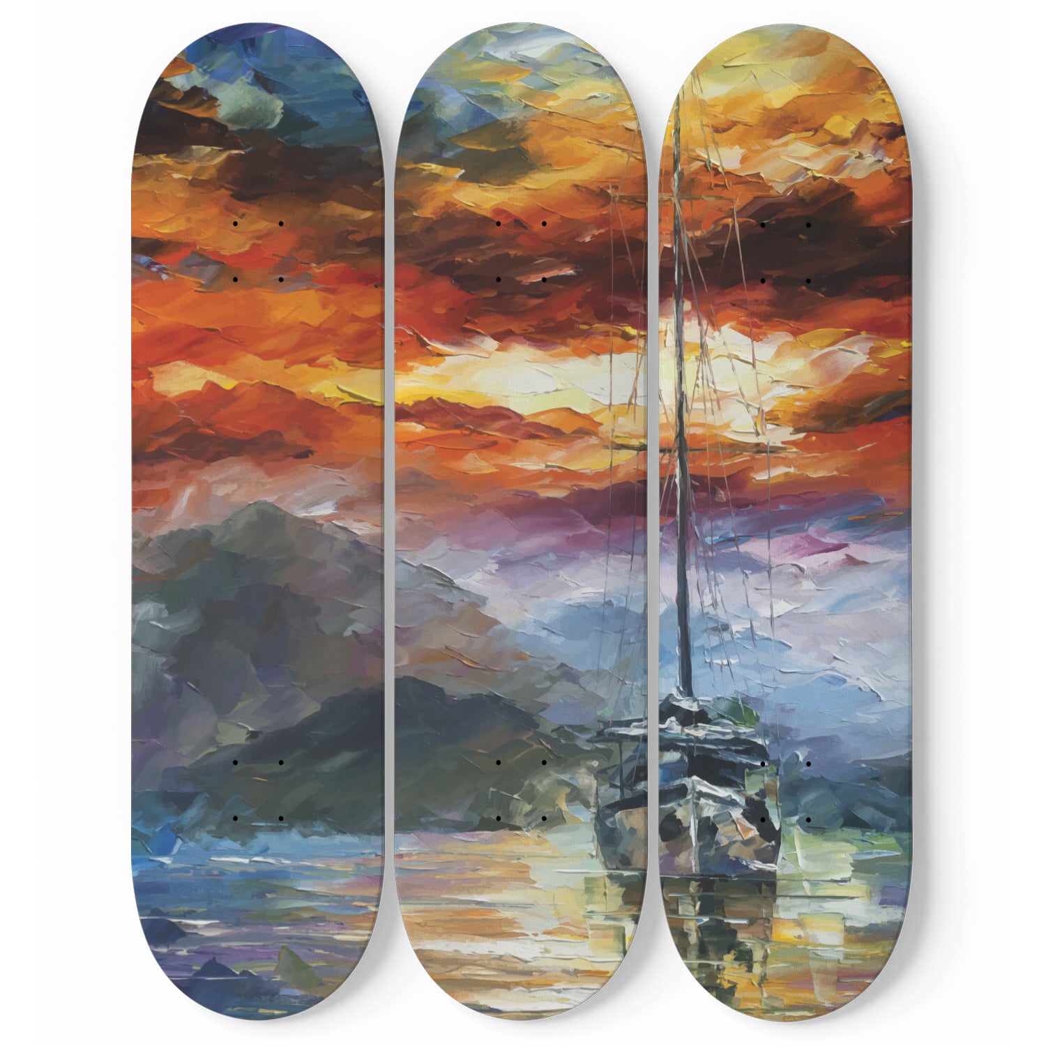 This set of 3 high-quality 7-ply 100% maple skateboards are the perfect statement piece for any home or office. Custom printed graphics, one-of-a-kind art piece.