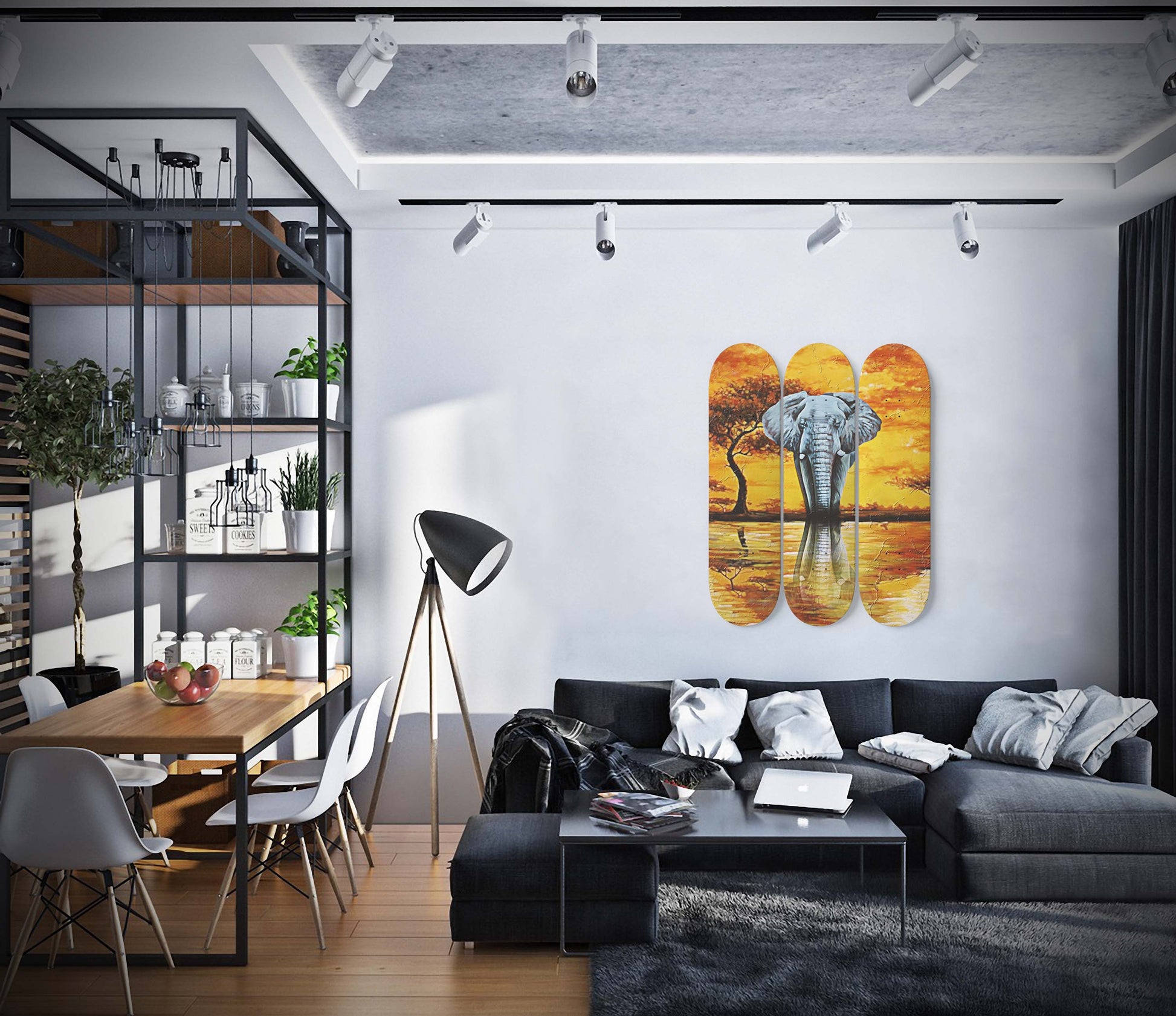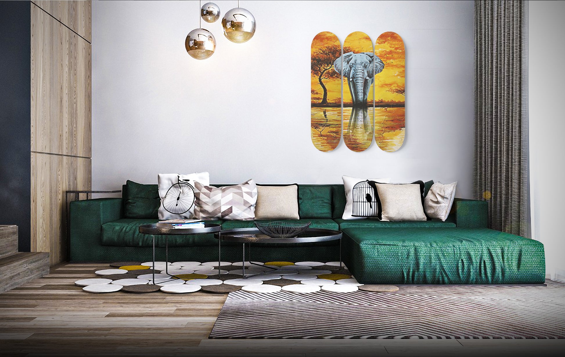 African Elephant Sunset Wall Print | 3 - Set Skateboard Wall Art, Pro - Grade Maple Wood, Living/Dining Room Wall Decor