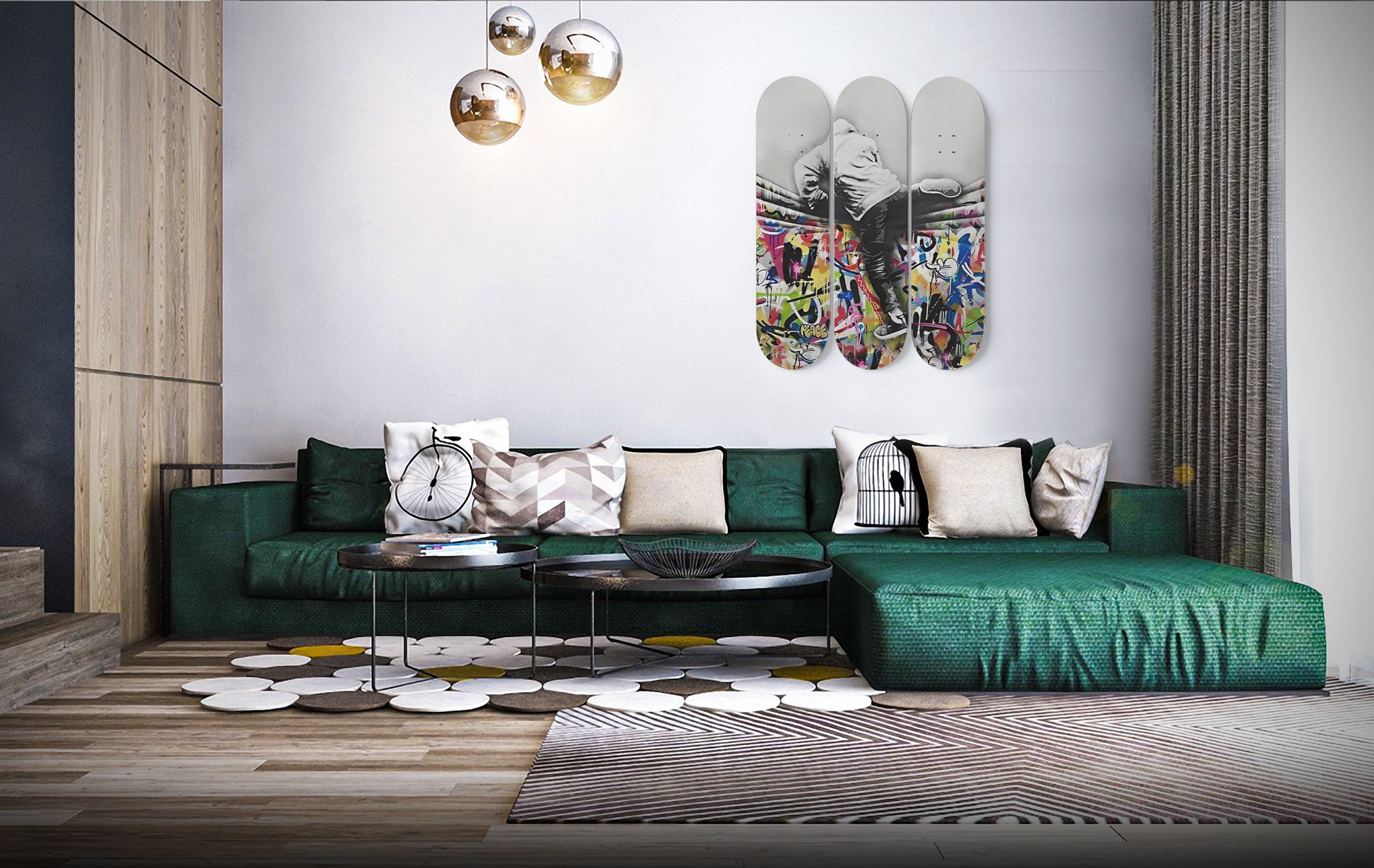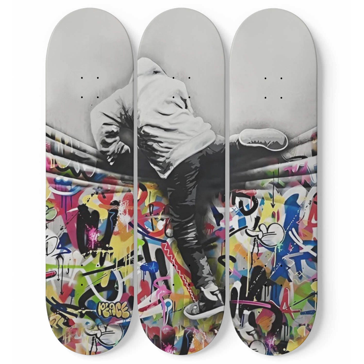 Banksy Man Jumping From Colourful Curtain | 3 - Set Skateboard Wall Art, Maple Wood Mount Wall Hanging, Home/Office Home Decor