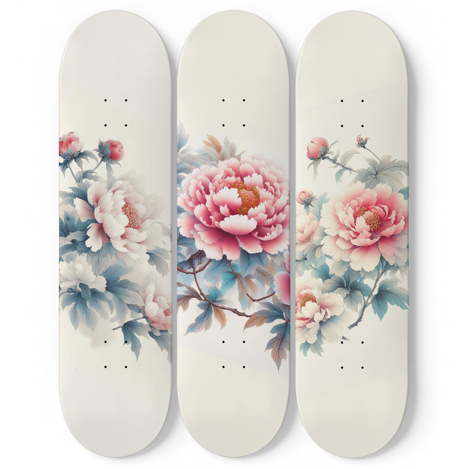 Experience the fusion of timeless elegance and urban expression with our Chinese Peony 3-Deck Skateboard Wall Art! Crafted from three authentic skateboard decks, this piece seamlessly intertwines the vibrant beauty of Chinese peonies with the dynamic canvas of skateboarding culture.