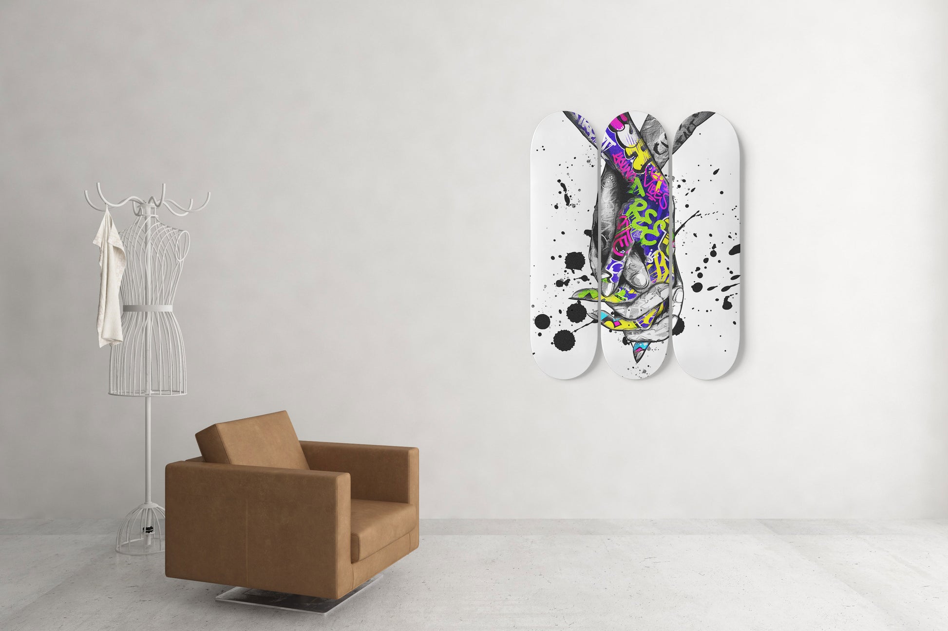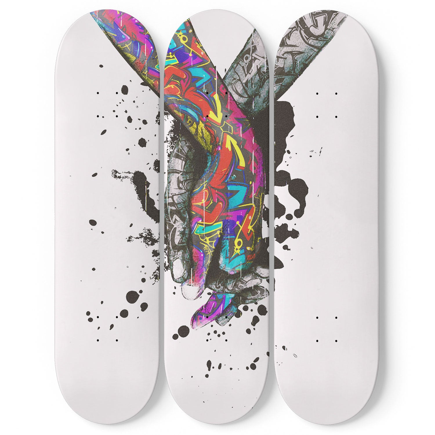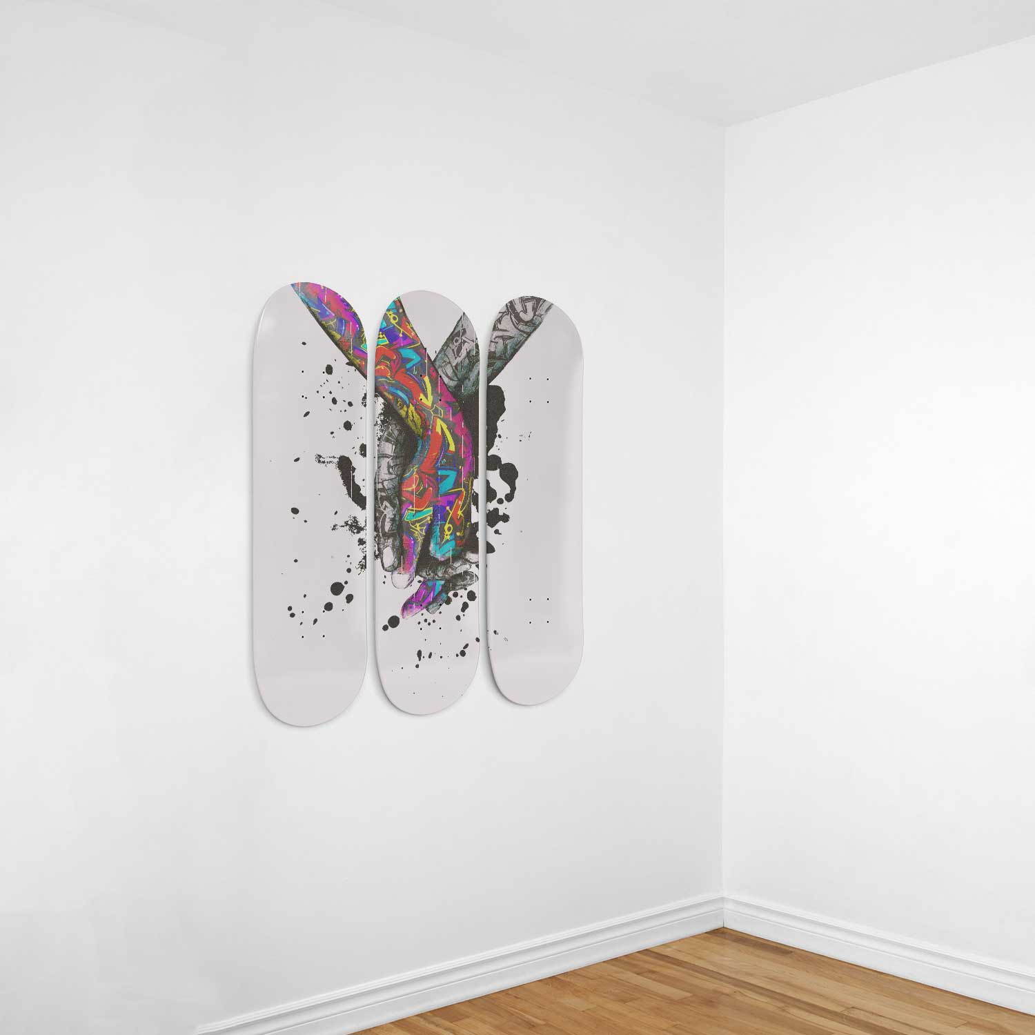 This set of 3 high-quality 7-ply 100% maple skateboards is the perfect statement piece for any home or office. Custom printed graphics, one-of-a-kind art piece.