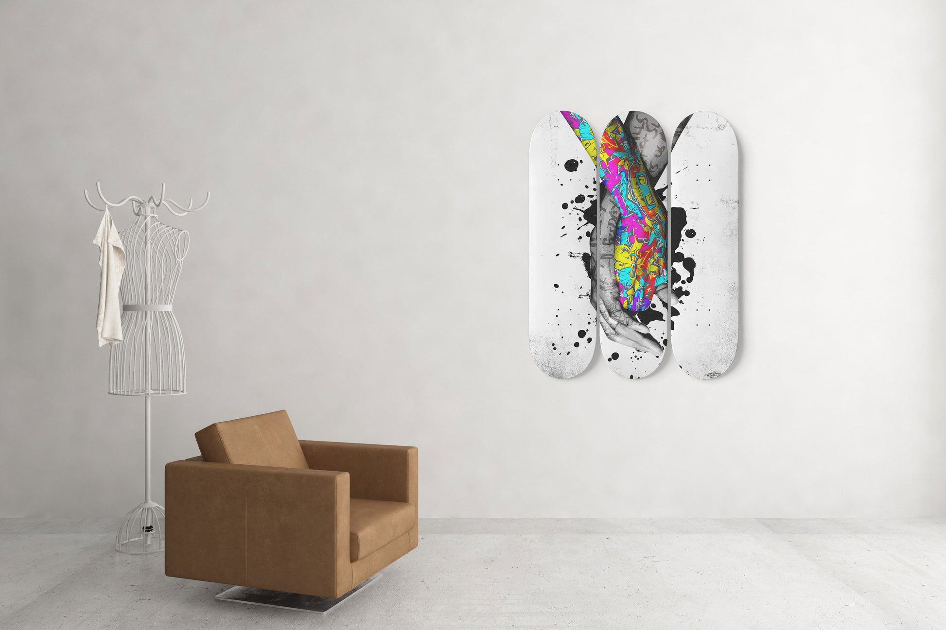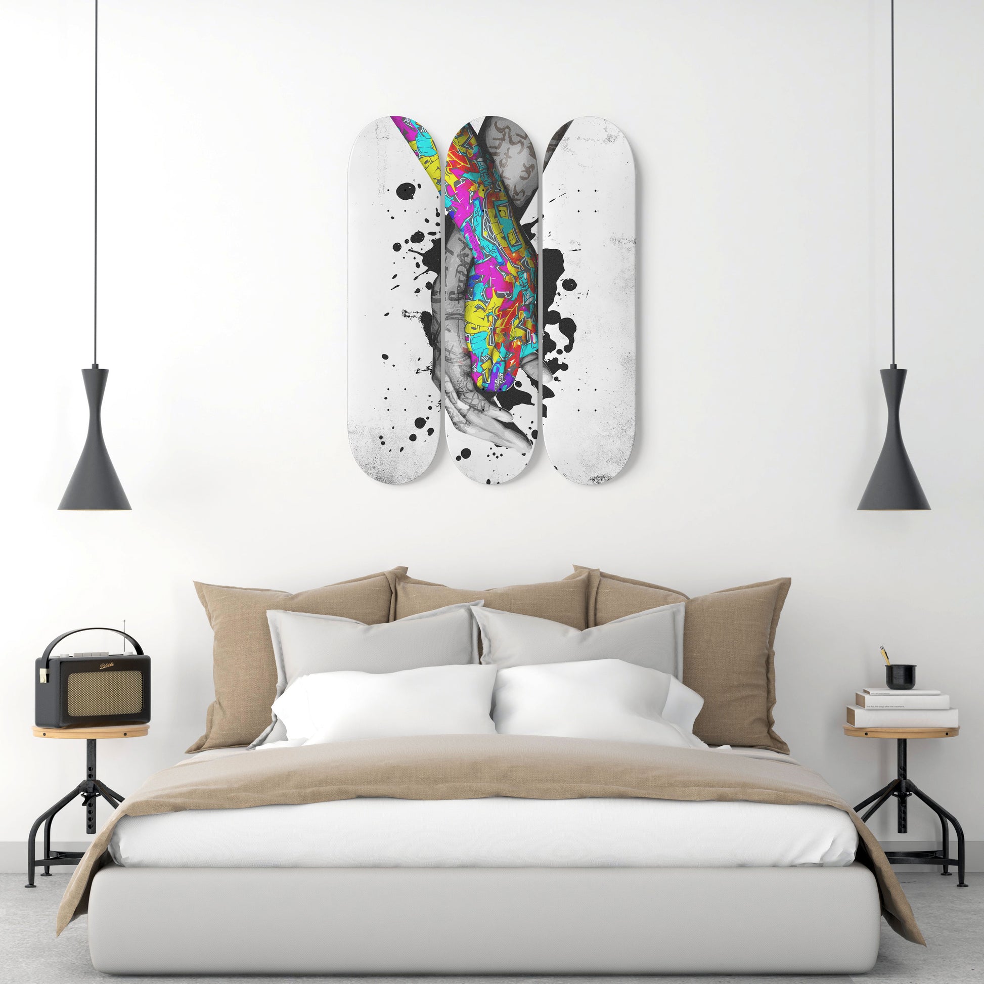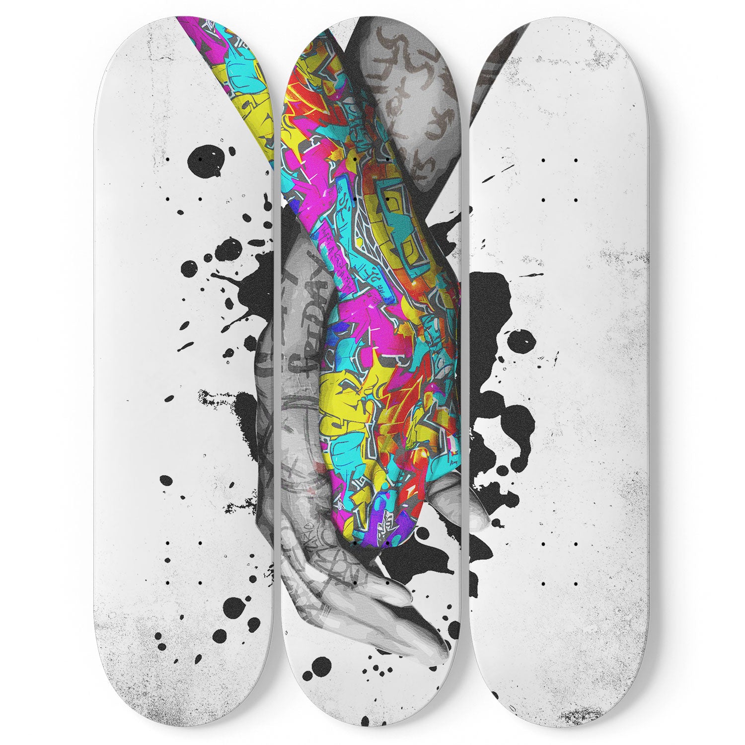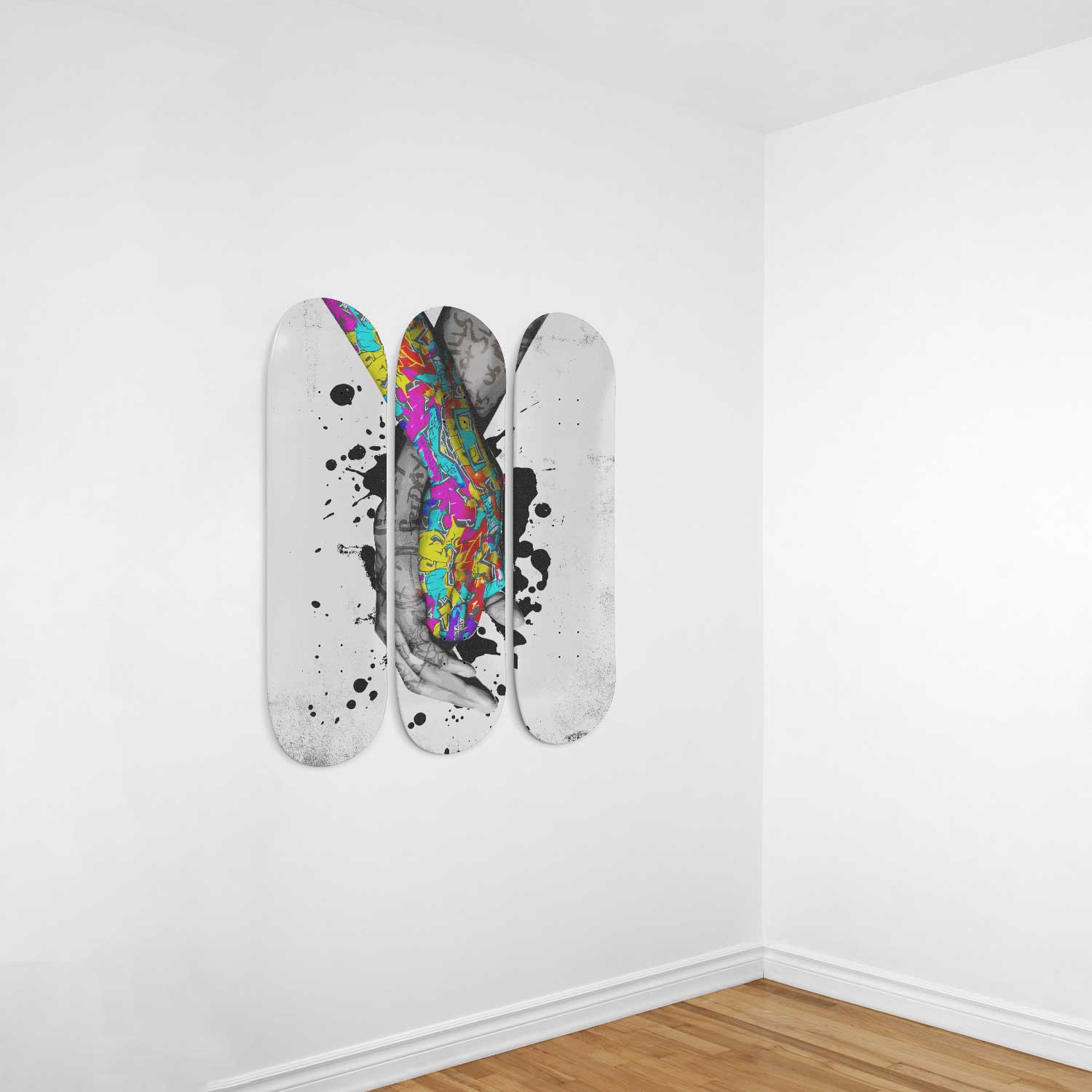 This set of 3 high-quality 7-ply 100% maple skateboards is the perfect statement piece for any home or office. Custom printed graphics, one-of-a-kind art piece.