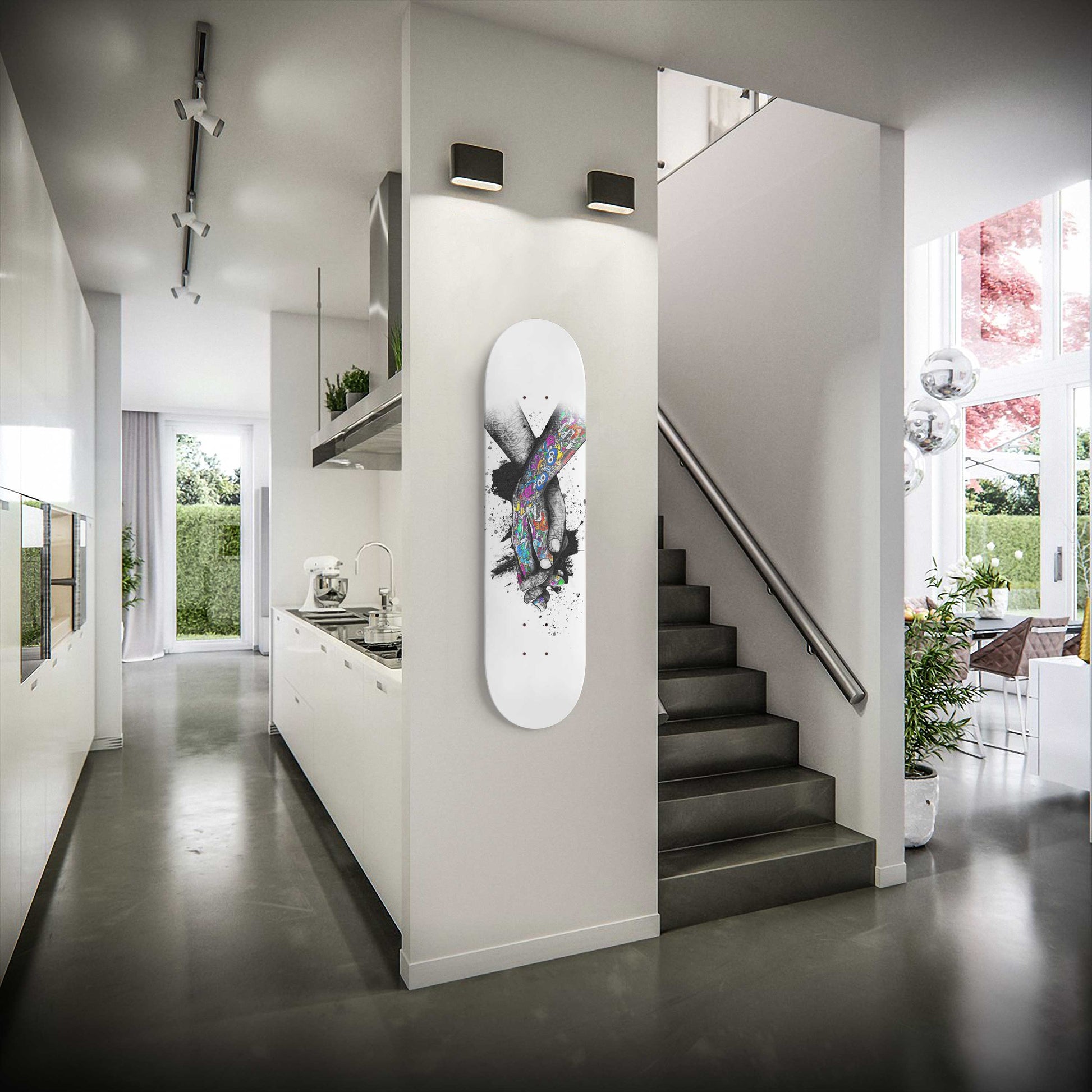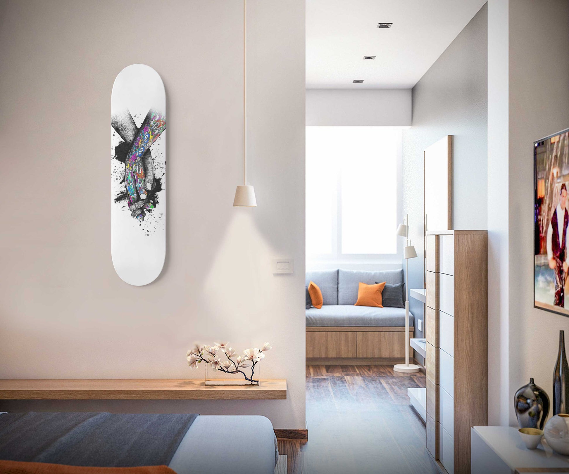 High-quality 7-ply 100% maple skateboard is the perfect statement piece for any home, office, or man cave! Custom printed graphics, unique art piece.