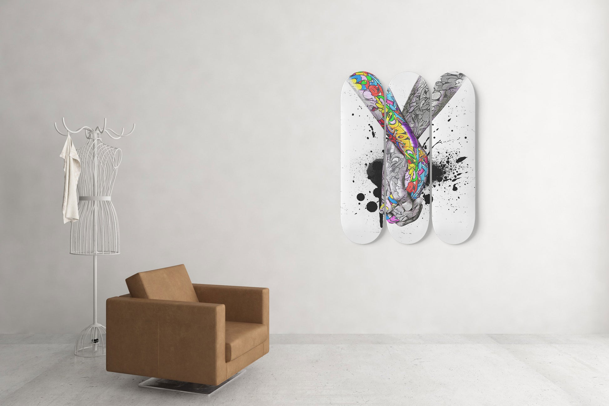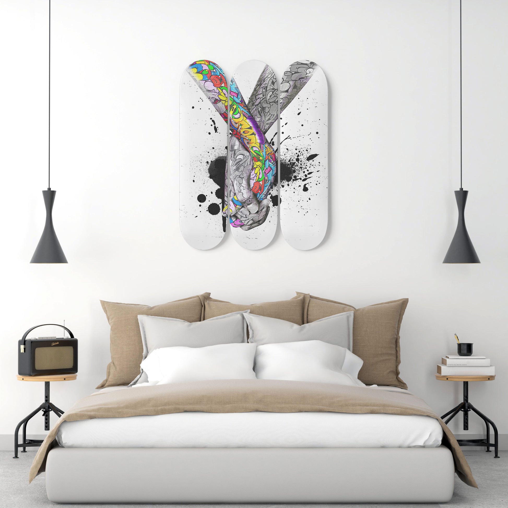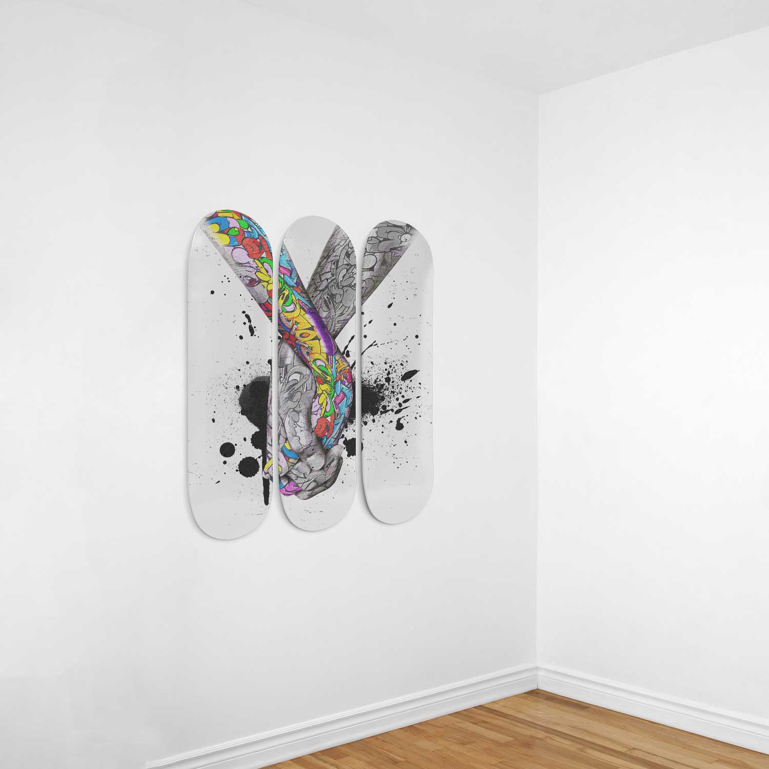 This set of 3 high-quality 7-ply 100% maple skateboards is the perfect statement piece for any home or office. Custom printed graphics, one-of-a-kind art piece.
