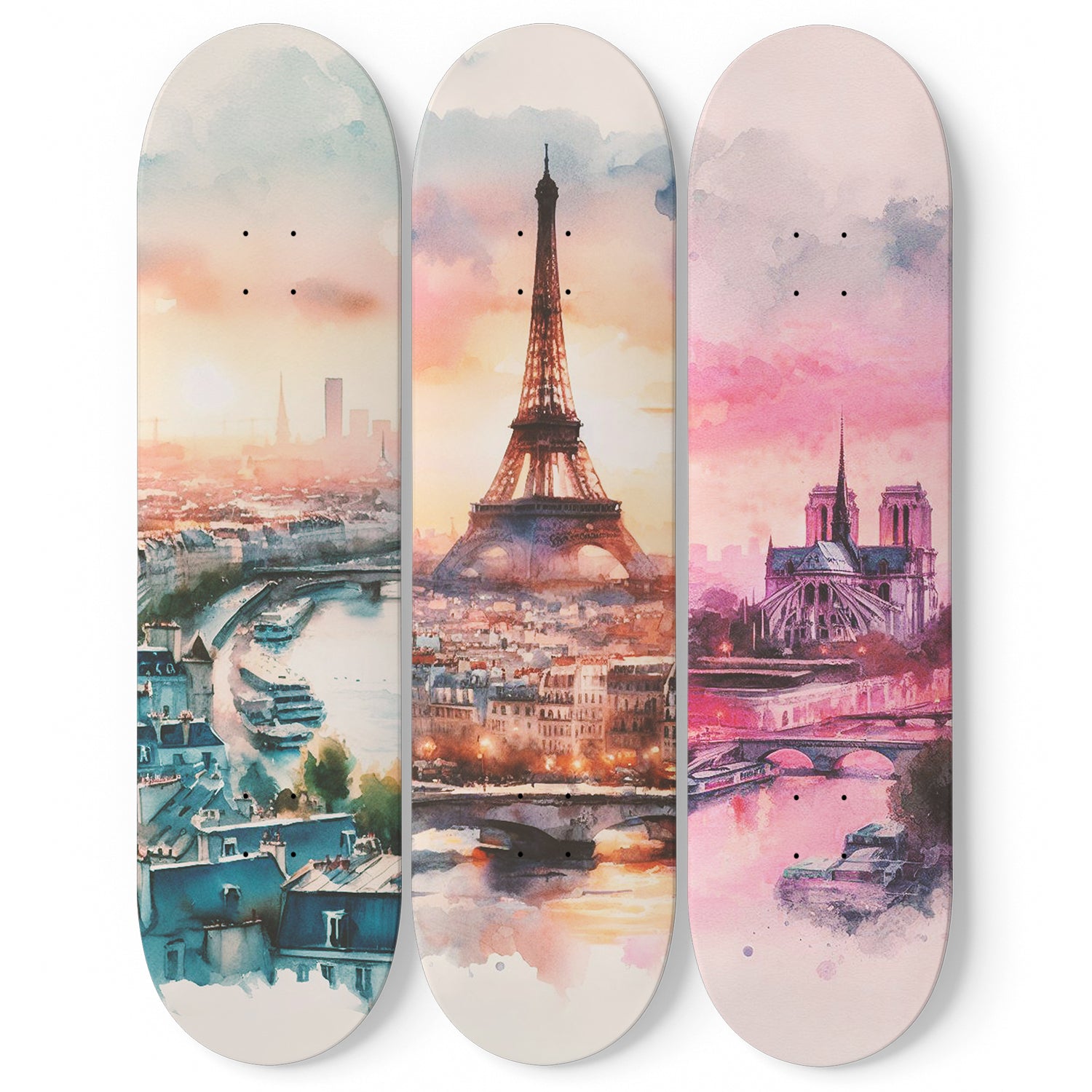 Experience the romantic allure of the "City Of Love" with our 3-deck?? Skateboard Wall Art. Crafted meticulously from three authentic skateboard decks, this artwork captures the enchanting essence and cultural richness of this iconic city.