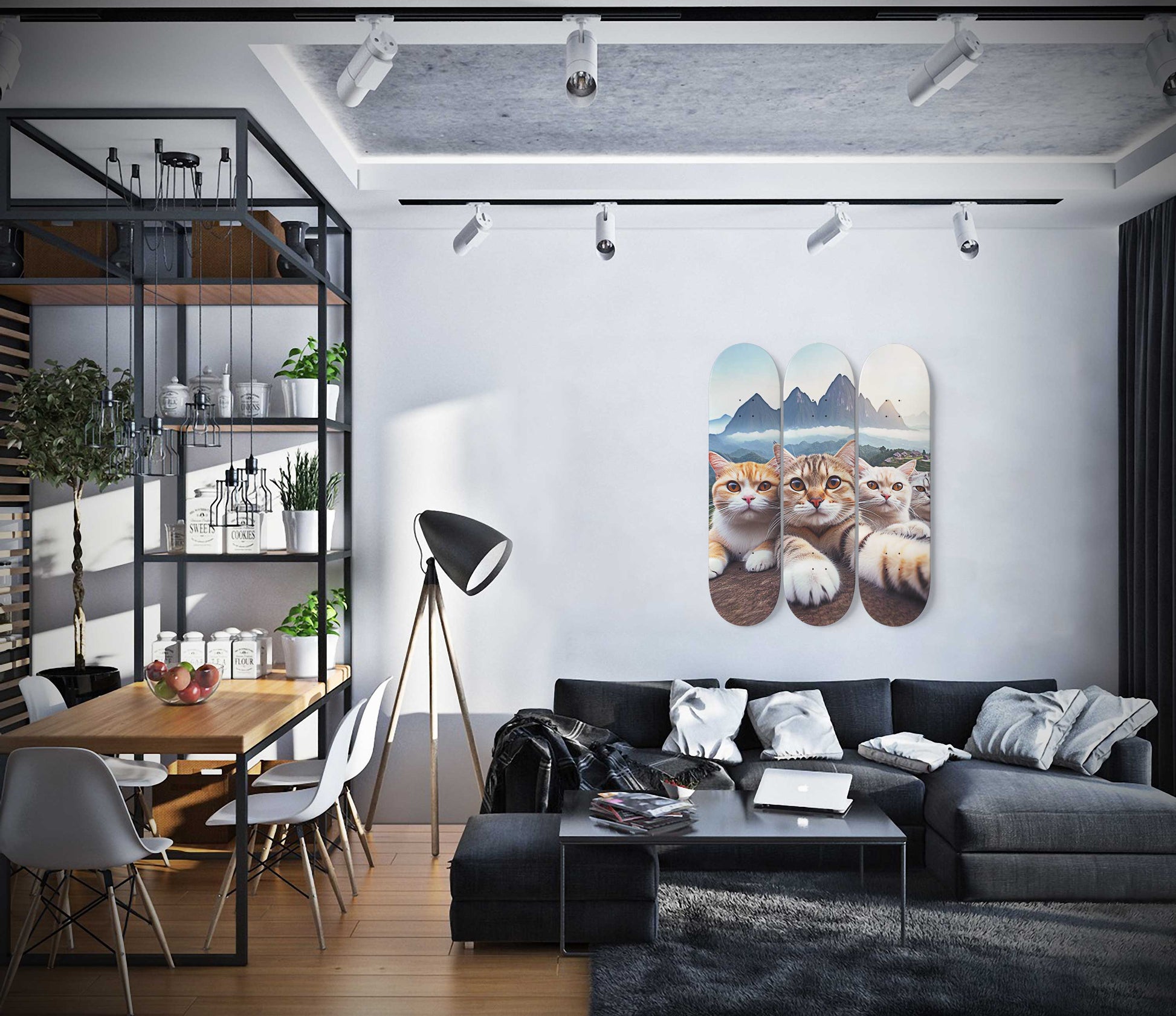 "Dive into the playful world of Selfie Cat #7 3-Deck Skateboard Wall Art - a captivating blend of art and urban vibes! This exclusive triptych artwork showcases a delightful feline taking a selfie, infusing character and charm into any room.