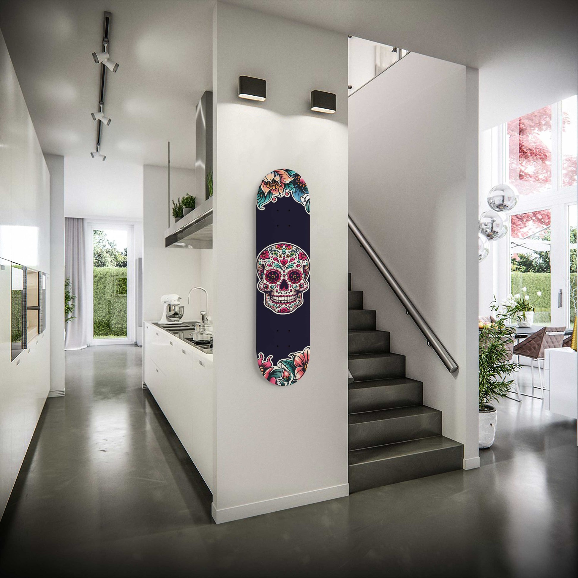 Introducing our Sugar Skull #6.0 Skateboard Wall Art ??a captivating blend of urban art and skateboarding culture that's perfect for those seeking a daring and unique statement piece for their space. This handcrafted masterpiece is not just a skateboard; it's an expression of rebellion, creativity, and the mesmerizing allure of the sugar skull motif.??High-quality 7-ply 100% maple skateboard is the perfect statement piece for any home, office, or man cave! Custom printed graphics, unique art piece.