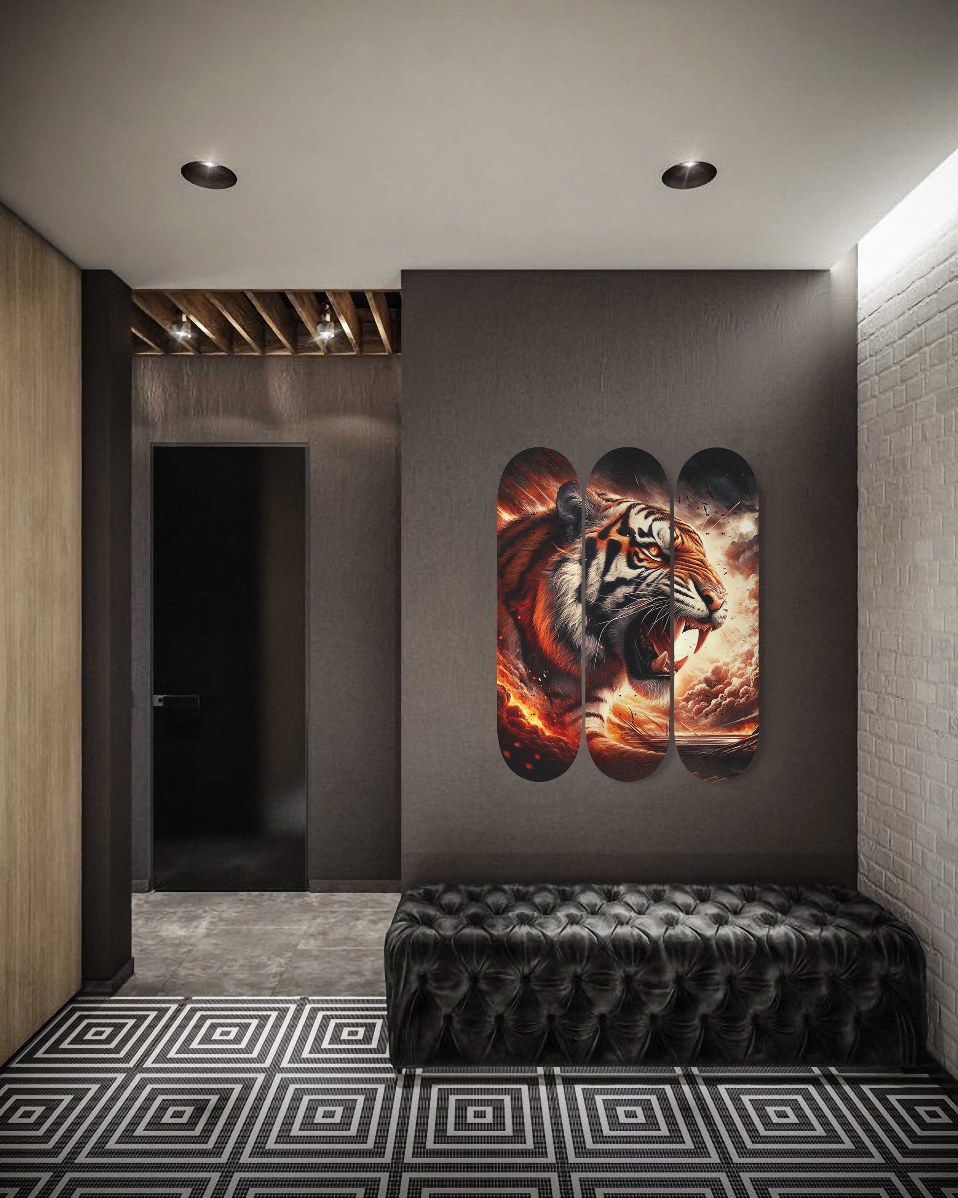 Transform your space into an edgy, vibrant haven with our Galaxy Tiger#3.0 3-Deck Skateboard Wall Art. This stunning piece showcases a fusion of cosmic allure and urban attitude, perfect for skateboard enthusiasts and art aficionados alike. Crafted with three high-quality skateboard decks, each adorned with a mesmerizing galaxy-inspired tiger design, this wall art exudes an aura of energy and style. The vivid colors and intricate detailing bring the tiger's cosmic presence to life, making it a captivating centerpiece for any room.