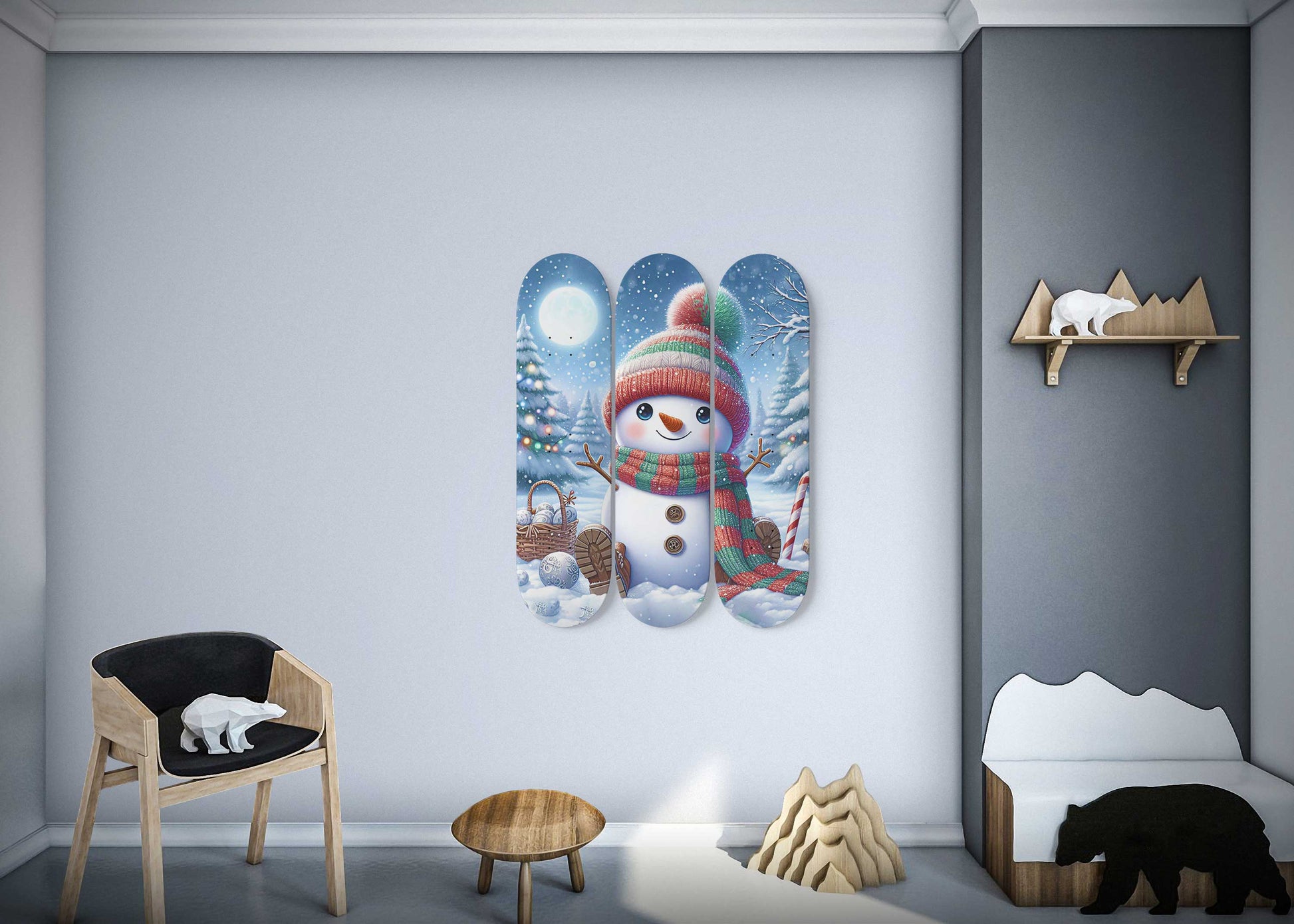 Get into the winter spirit with our Frosty Snowman 3-Deck Skateboard Wall Art! Each deck in this charming set features a meticulously.Crafted snowman design, bringing the whimsy of the season into your space. Handcrafted with care, these skateboards are more than just decorative pieces; they're durable and built to last.