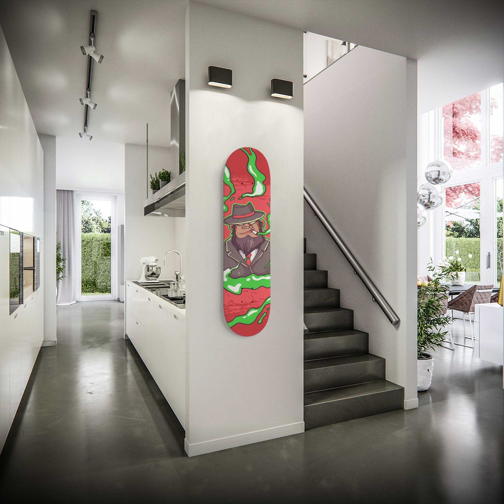 High-quality 7-ply 100% maple skateboard is the perfect statement piece for any home, office, or man cave! Custom printed graphics, unique art piece.
