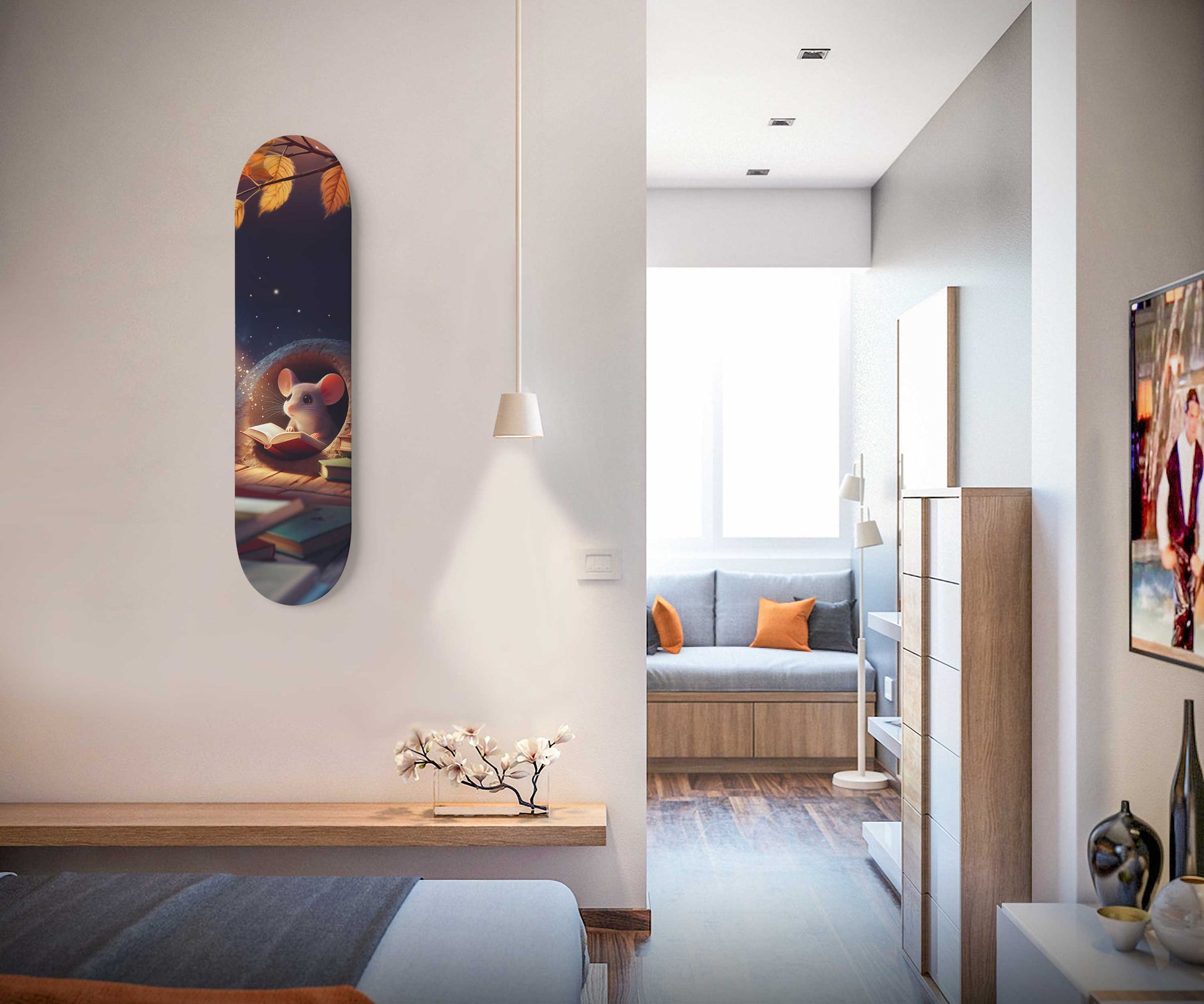 Elevate your space with our charming Mouse Reading Book 1-Deck Skateboard Wall Art! This unique piece merges artistry and functionality, adding a touch of playfulness to any room.