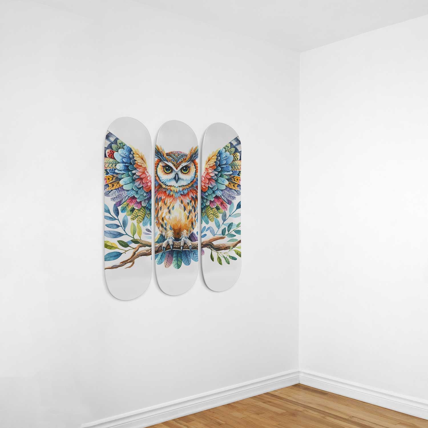Immerse your space in the captivating essence of urban artistry with our Owl#5.0 3-Deck Skateboard Wall Art a trio of skateboard decks that blend creativity and street style seamlessly. Each deck showcases the exclusive Owl#5.0 design, featuring mesmerizing owl-themed graphics infused with vibrant, dynamic colors, embodying the spirit of street art and skateboarding culture.