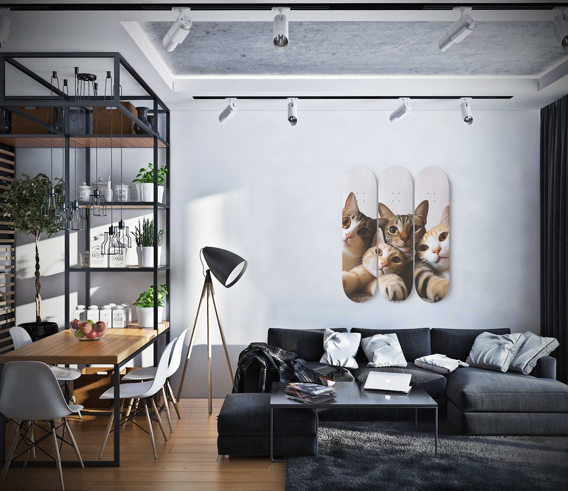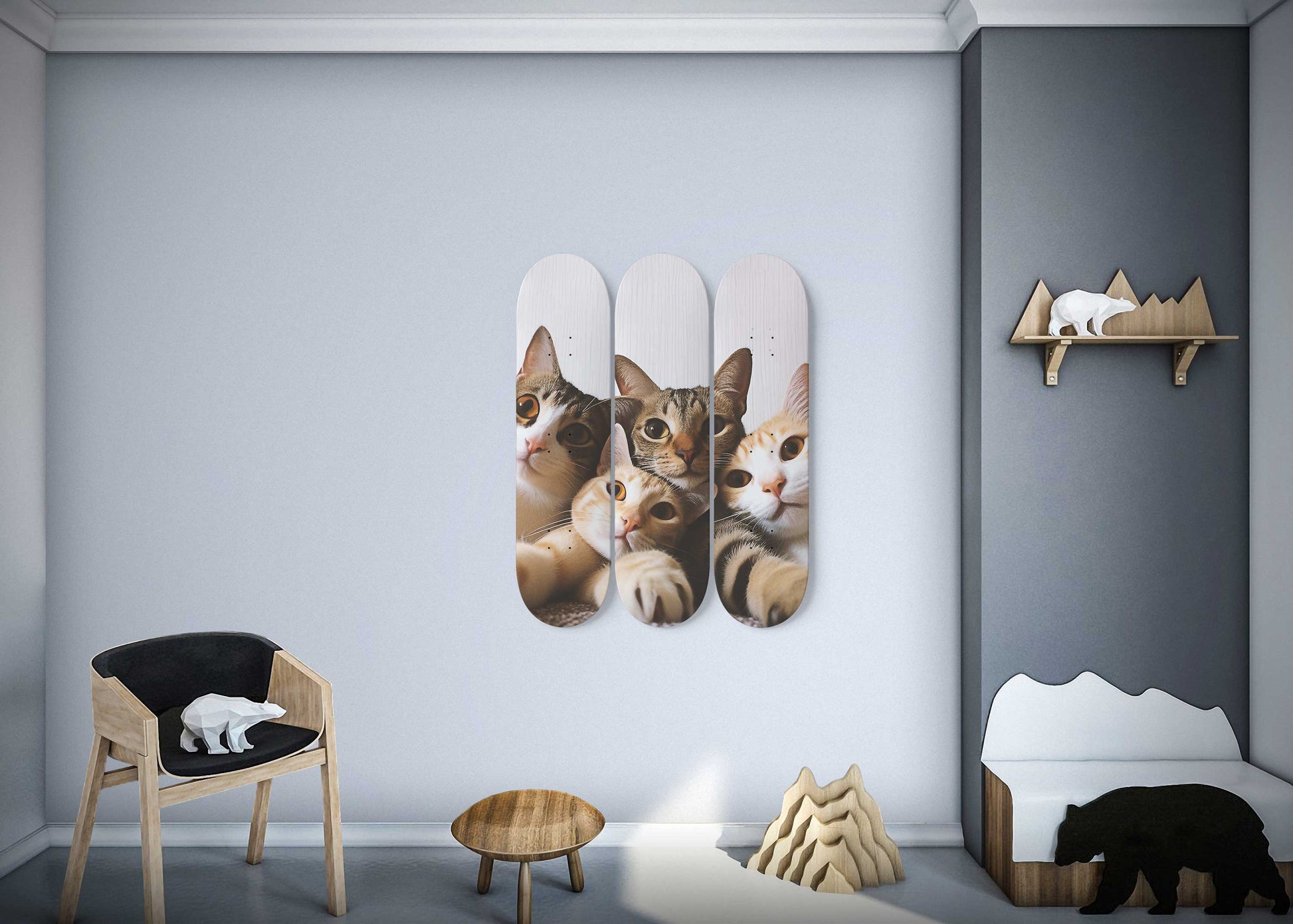 "Introducing the mesmerizing Selfie Cat #4 3-Deck Skateboard Wall Art?? a fusion of artistry and urban edge! This exclusive triptych artwork features a charismatic feline capturing a selfie, adding a playful and charismatic vibe to any space.