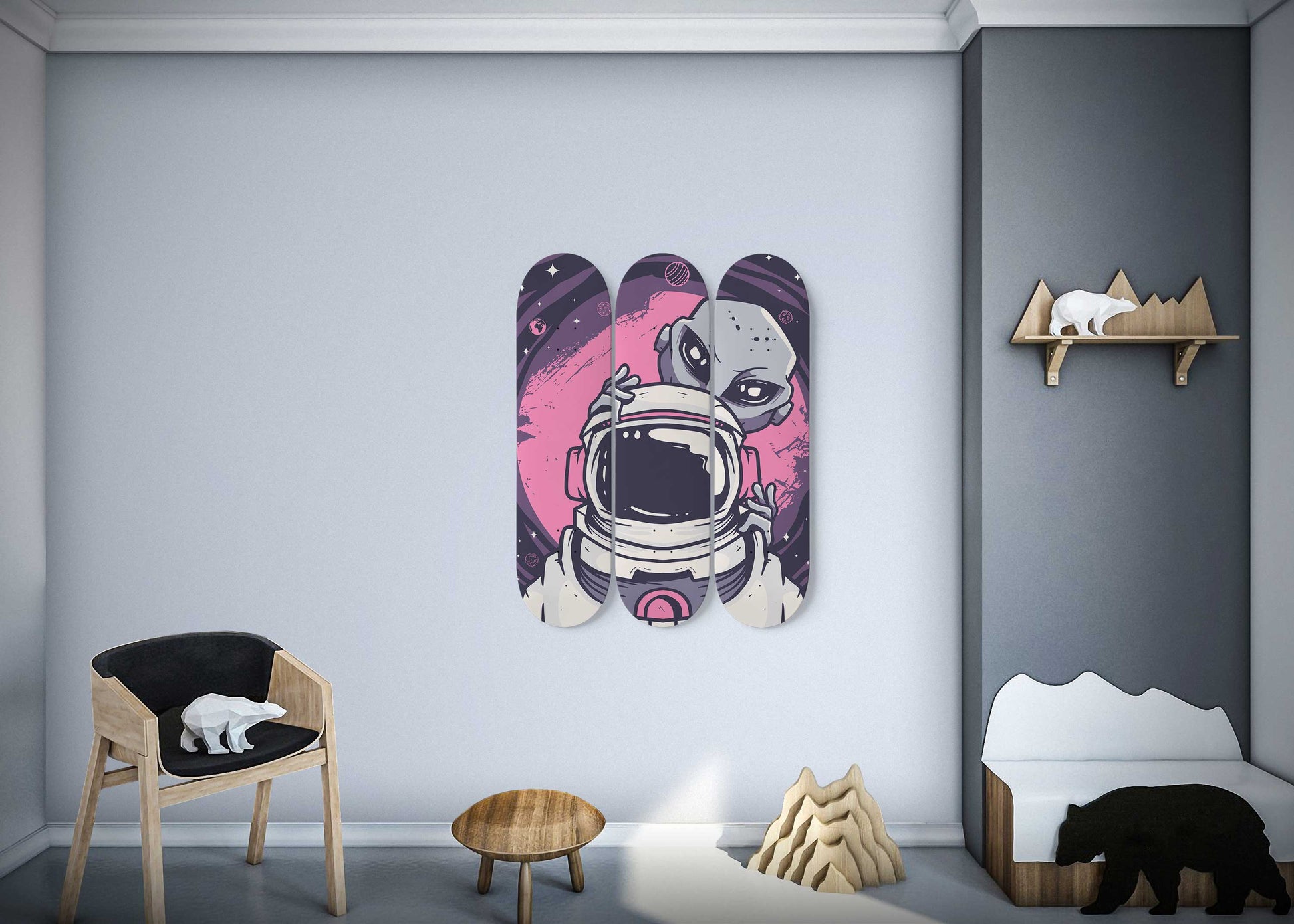 This set of 3 high-quality 7-ply 100% maple skateboards is the perfect statement piece for any home or office. Custom printed graphics, one-of-a-kind art piece.