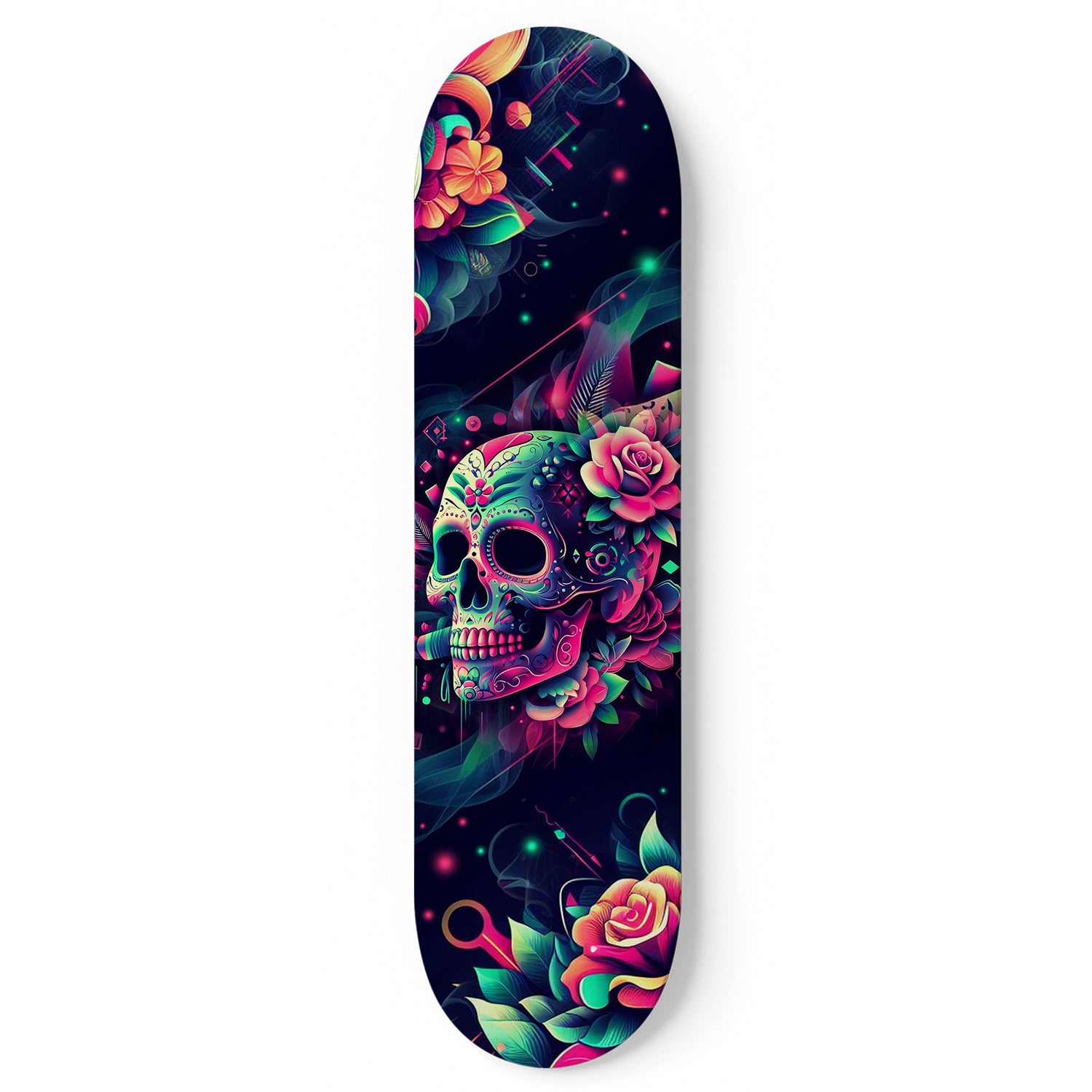 Introducing our Sugar Skull #5.0 Skateboard Wall Art - a striking fusion of urban art and skateboard culture that's perfect for anyone looking to make a bold statement in their space. This handcrafted masterpiece isn't just a skateboard; it's a piece of art that captures the essence of rebellion, creativity, and the allure of the sugar skull motif.High-quality 7-ply 100% maple skateboard is the perfect statement piece for any home, office, or man cave! Custom printed graphics, unique art piece.