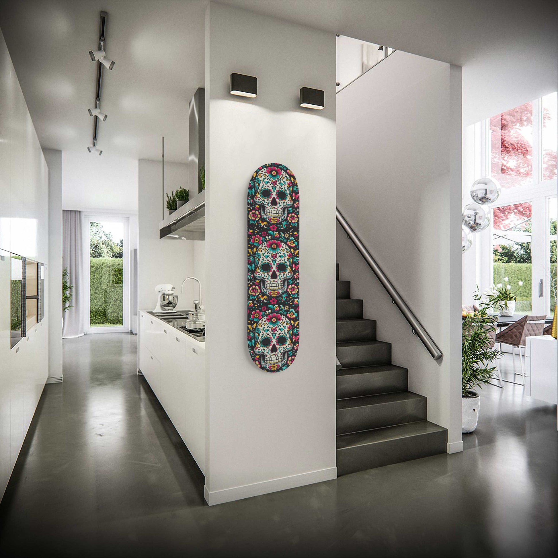 Embrace the festive and cultural beauty of Dia de los Muertos with our Sugar Skull #3.0 Skateboard Wall Art. This exceptional piece showcases a meticulously designed Sugar Skull on a premium skateboard deck, paying tribute to the vibrant traditions and spirit of Dia de los Muertos. Carefully hand-assembled, it's ready to adorn your home, office, or any space with its lively and cultural charm.