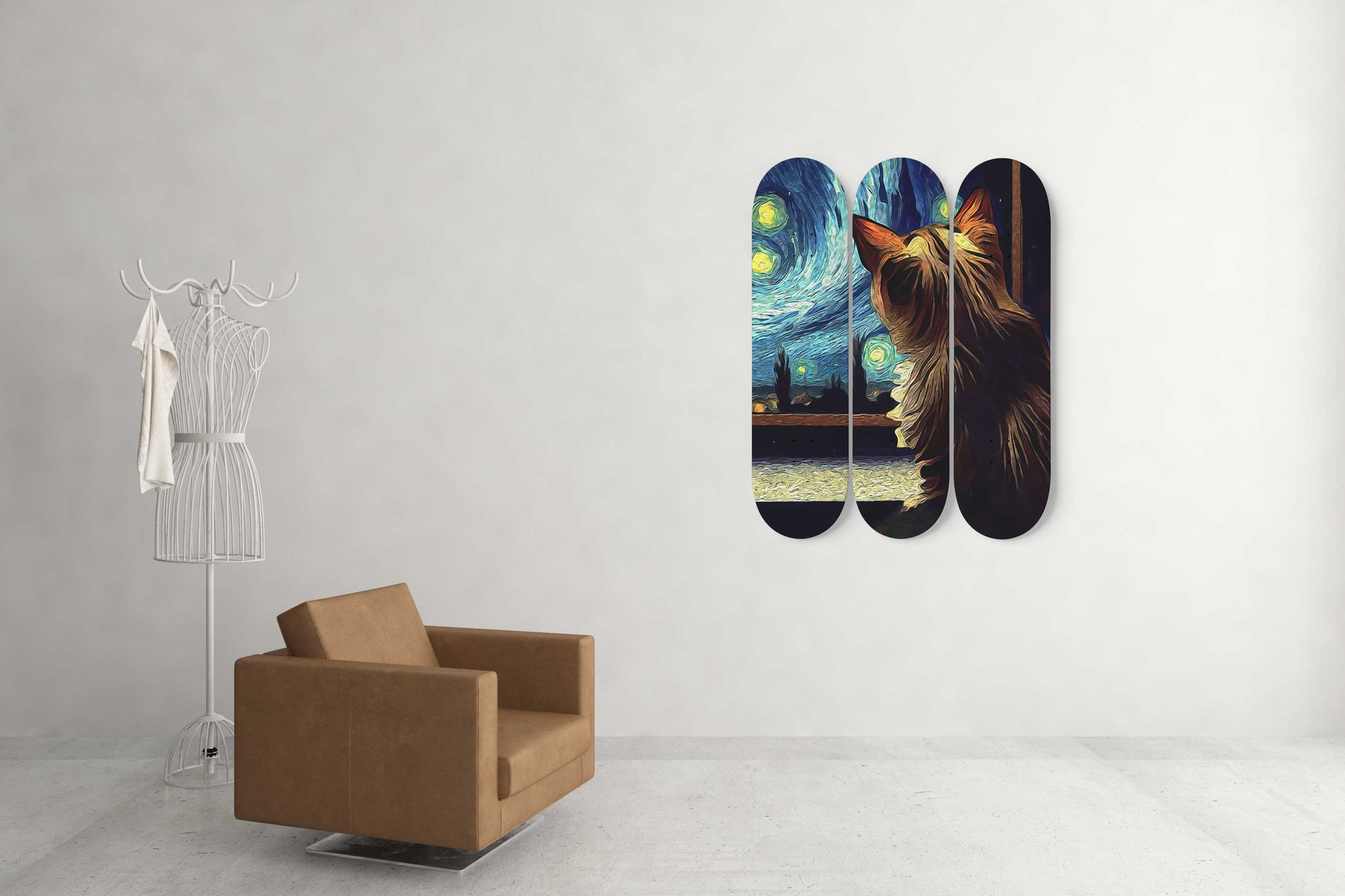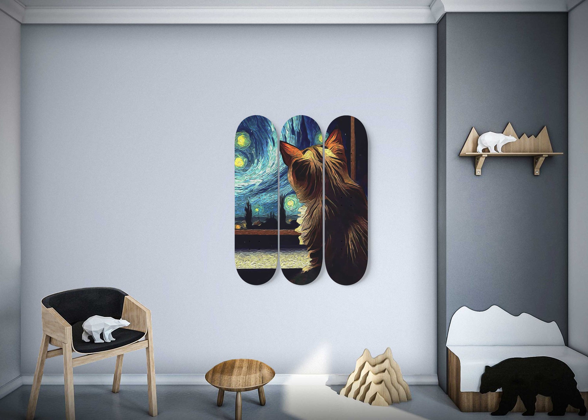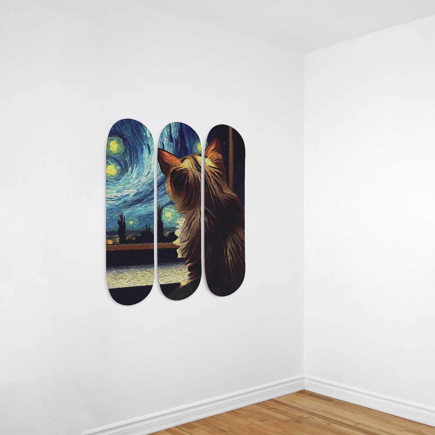 Van Gogh Cat Under Starry Night 3-Deck Skateboard Wall Art: Purr-fectly Artistic