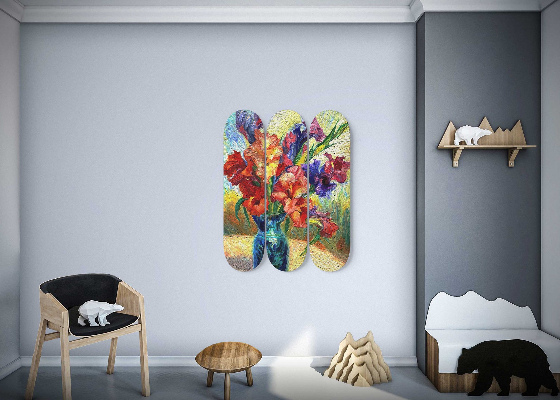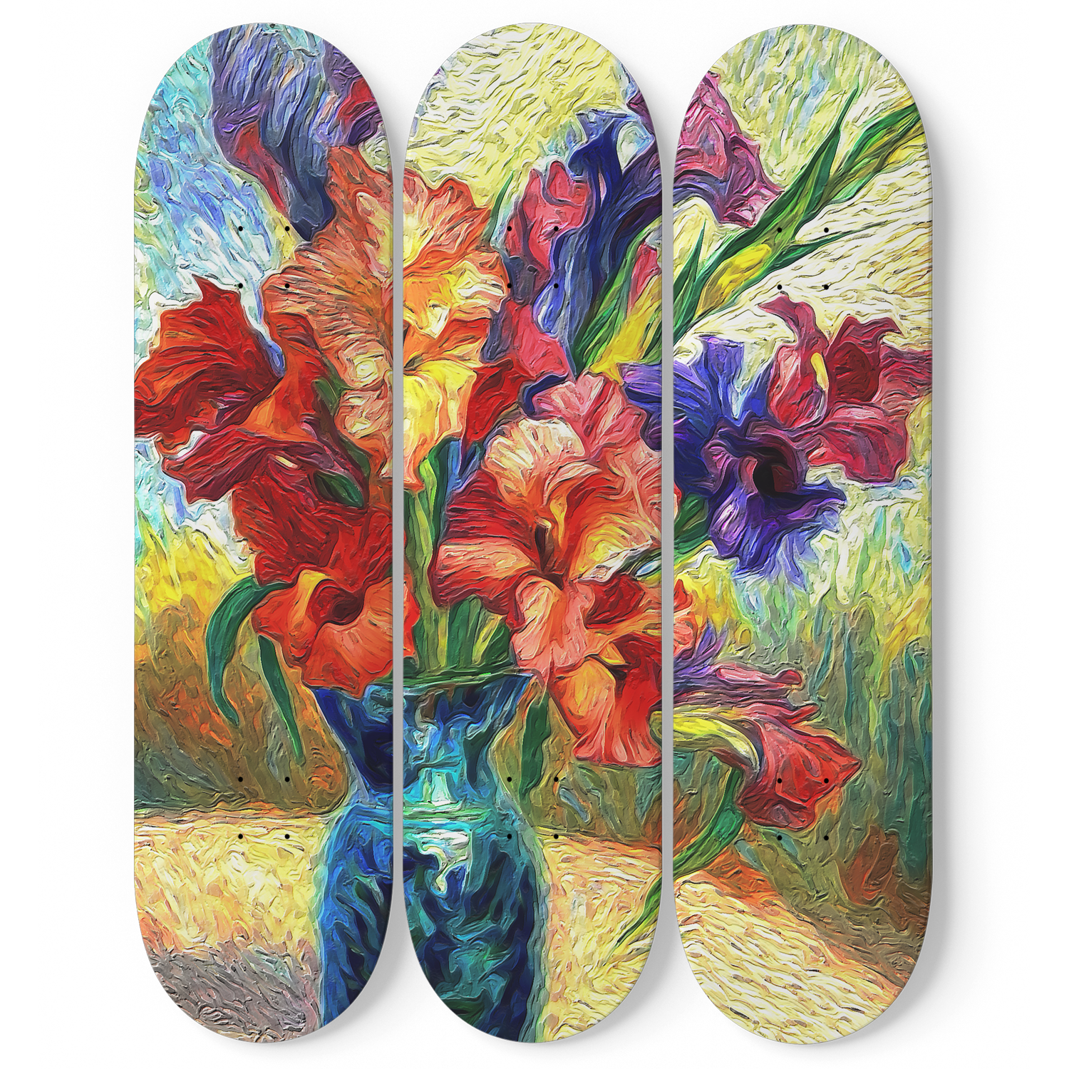Step into the vibrant world of Vincent van Gogh's "Gladioli Inside the Base" reimagined with a nature-inspired design. Our Van Gogh Gladioli Inside the Base 3-Deck Skateboard Wall Art is not just a masterpiece; it's a colorful connection to the natural world, perfect for art enthusiasts and those who appreciate the beauty of gladioli.