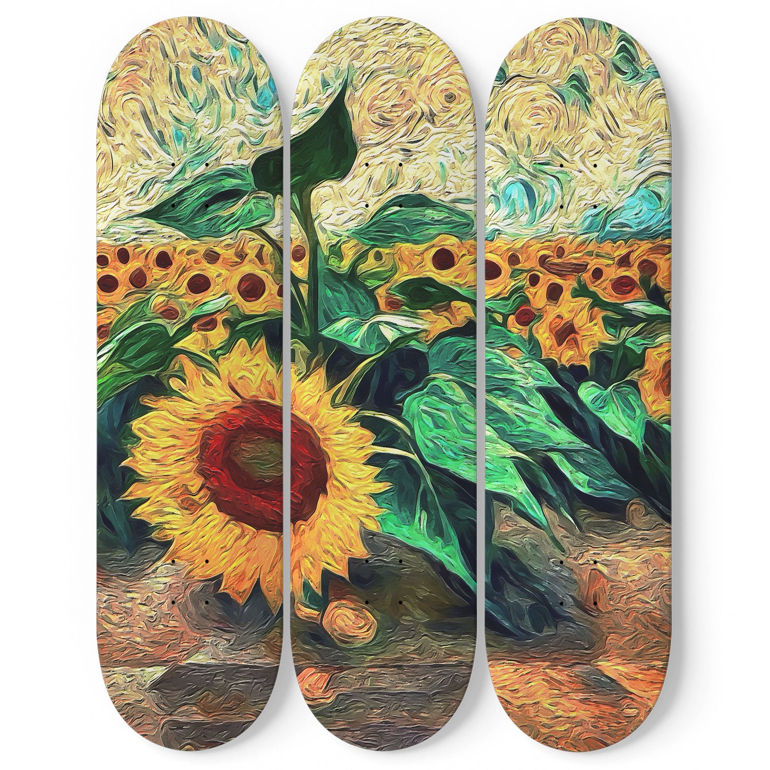 Step into the vibrant world of Vincent van Gogh's "Sunflower Garden" reimagined with a nature-inspired design. Our Van Gogh Sunflower Garden 3-Deck Skateboard Wall Art is not just a masterpiece; it's a colorful connection to the natural world, perfect for art enthusiasts and those who appreciate the beauty of sunflowers.