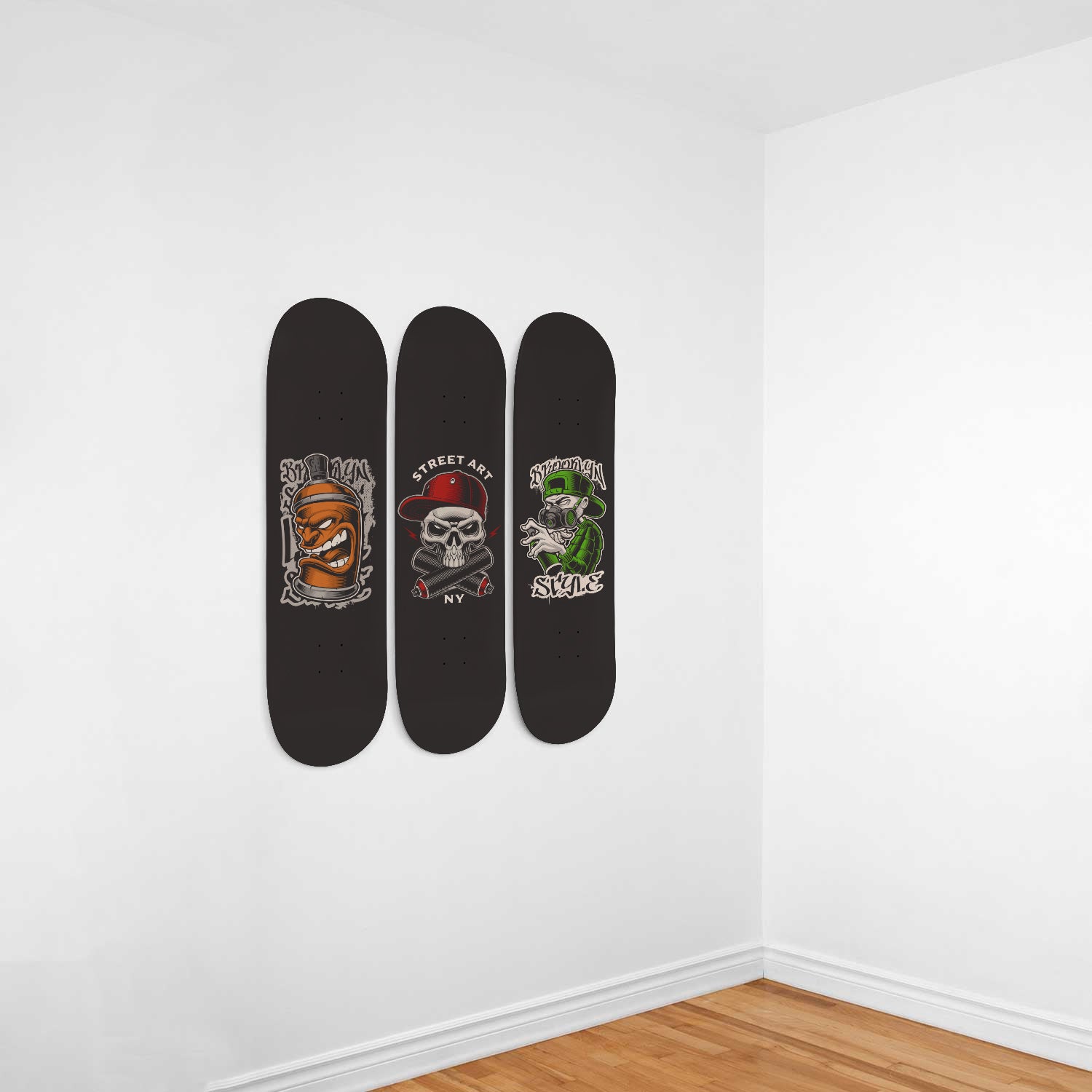 This set of 3 high-quality 7-ply 100% maple skateboards are the perfect statement piece for any home or office. Custom printed graphics, one-of-a-kind art piece.