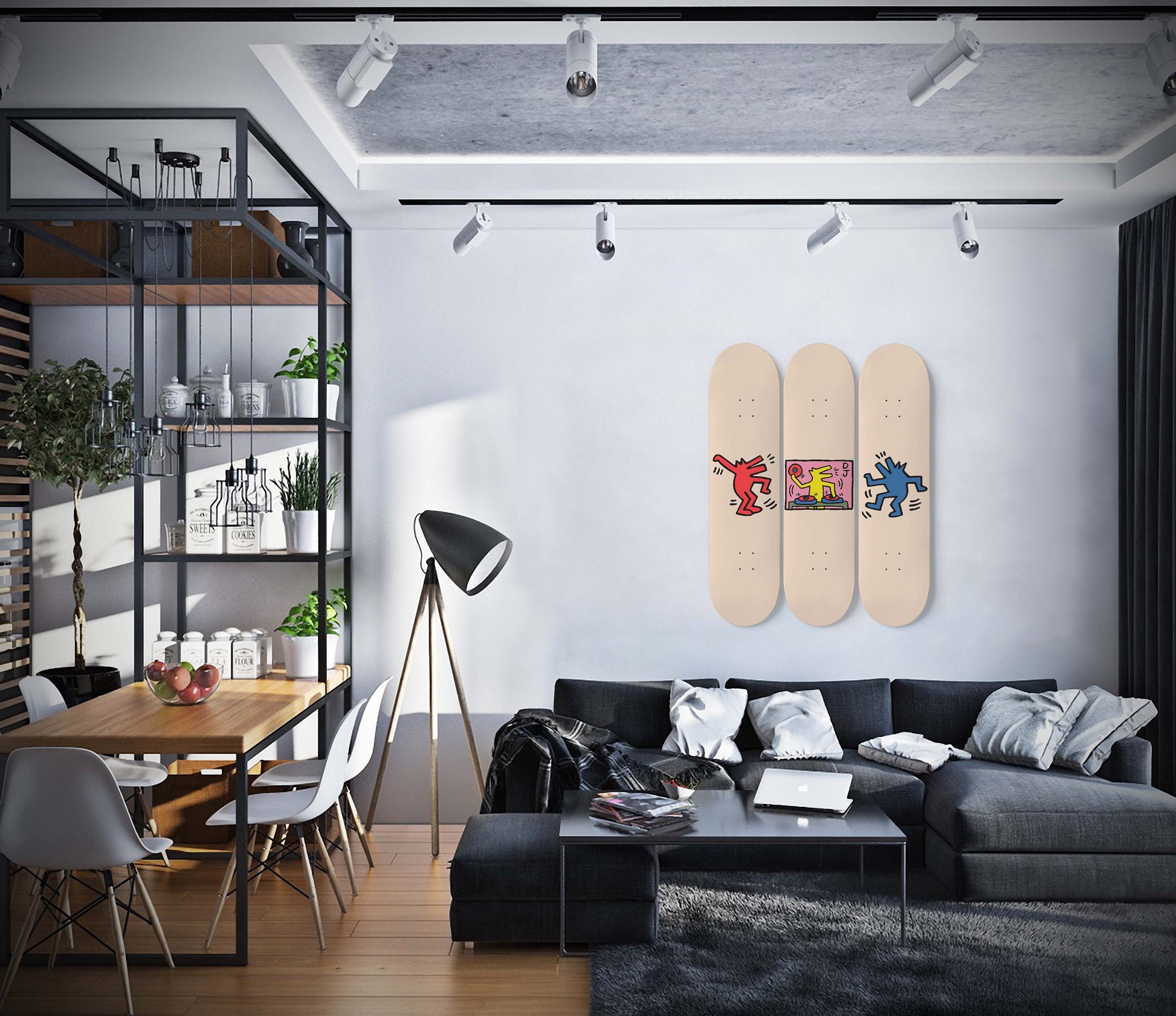 Lithography, silk-screening, etching, woodcuts, embossing ??Haring worked in all these ??eplication??techniques, Decorate your office room or give as a present to your beloved ones with retro-inspired artwork. Surprise someone special with this Keith Haring Inspired Skateboard Wall Art! It is perfect for the living room, bedroom, cafe, or entryway.
