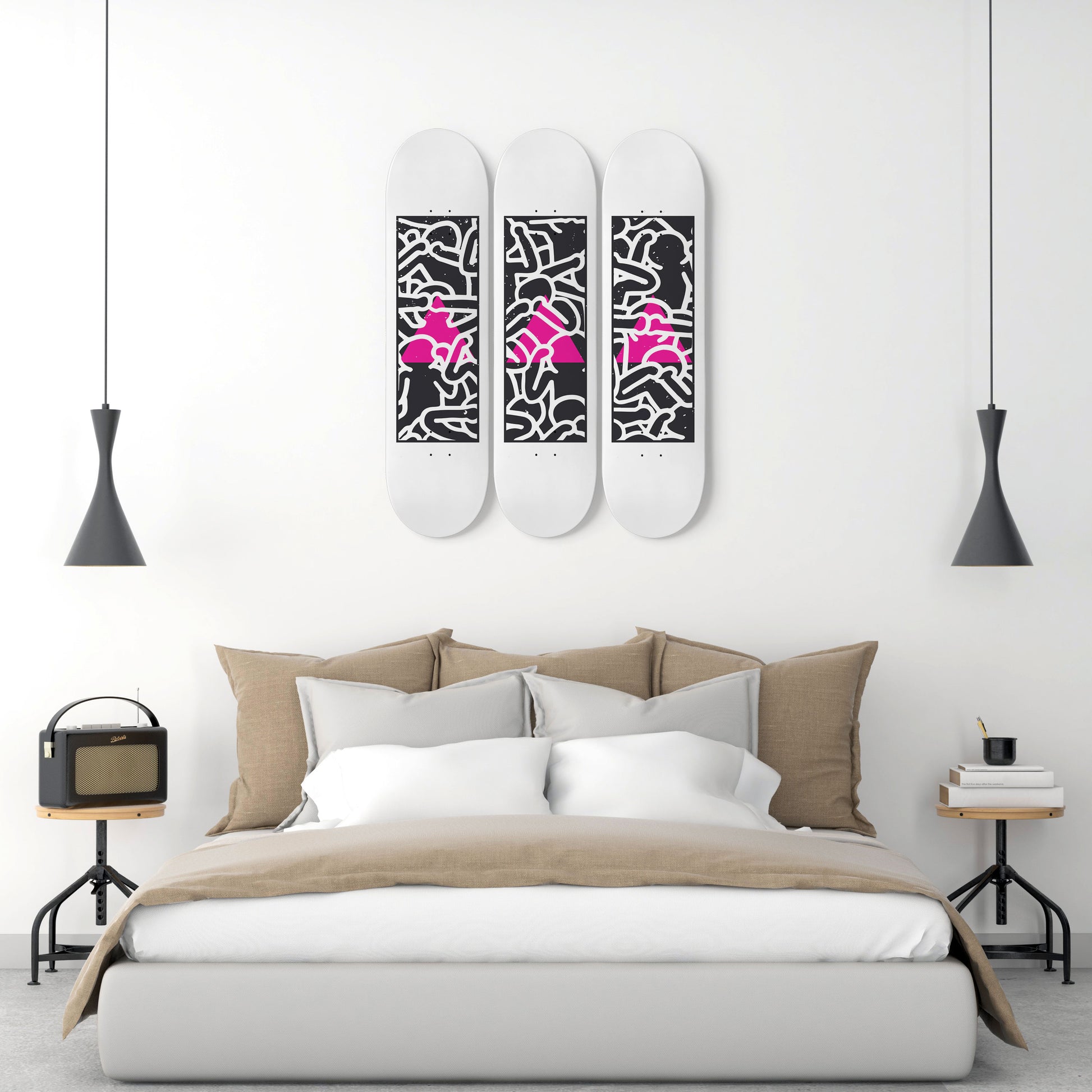 Unleash the vibrant energy of Keith Haring's iconic artwork with our "Silence" 3 Deck Skateboard Wall Art set. This visually striking, handcrafted piece beautifully blends urban street art and skateboard culture into a compelling and dynamic focal point for your space.
