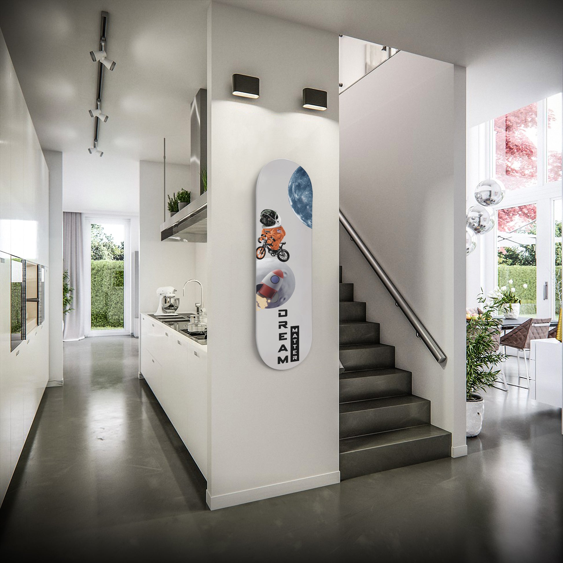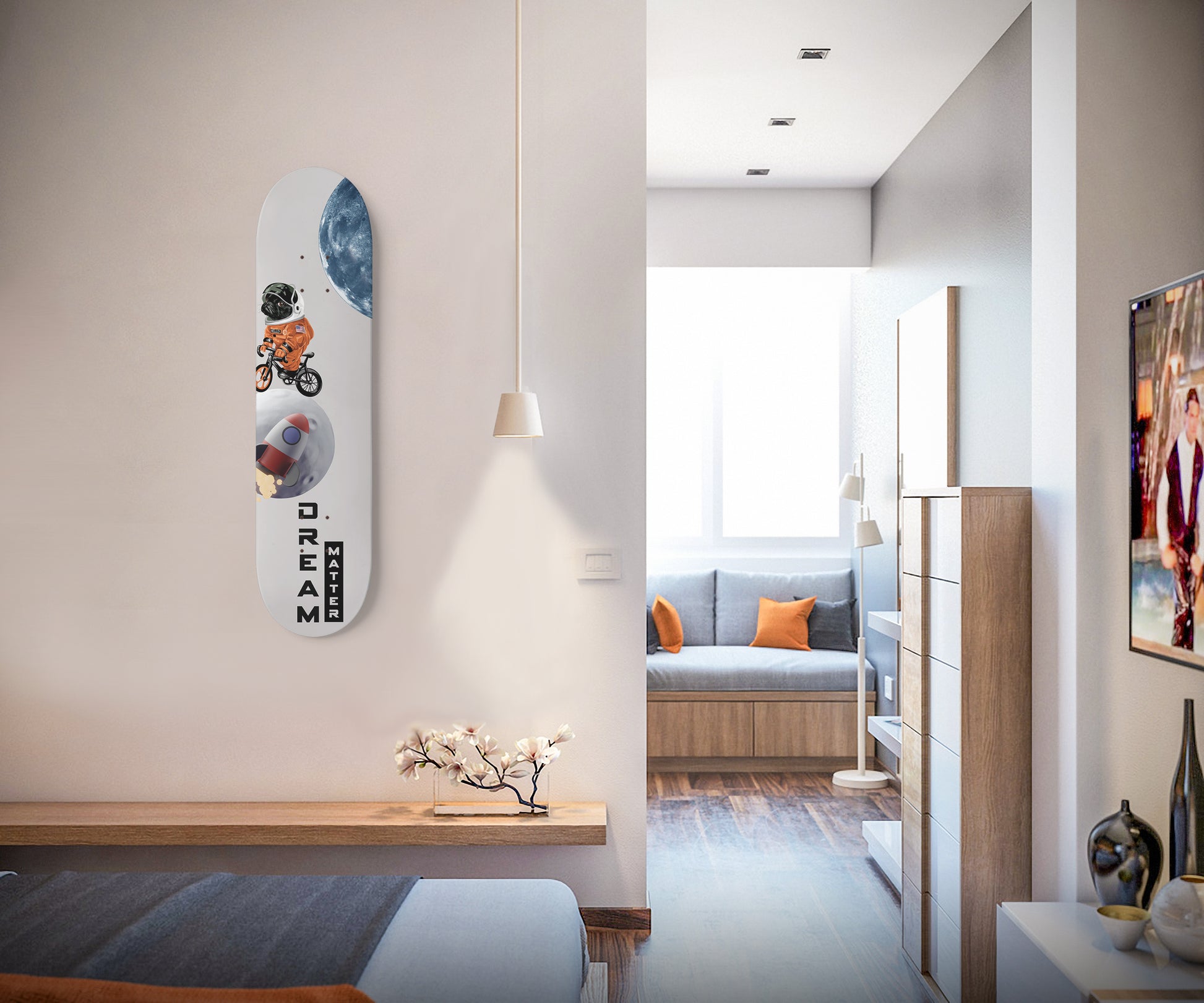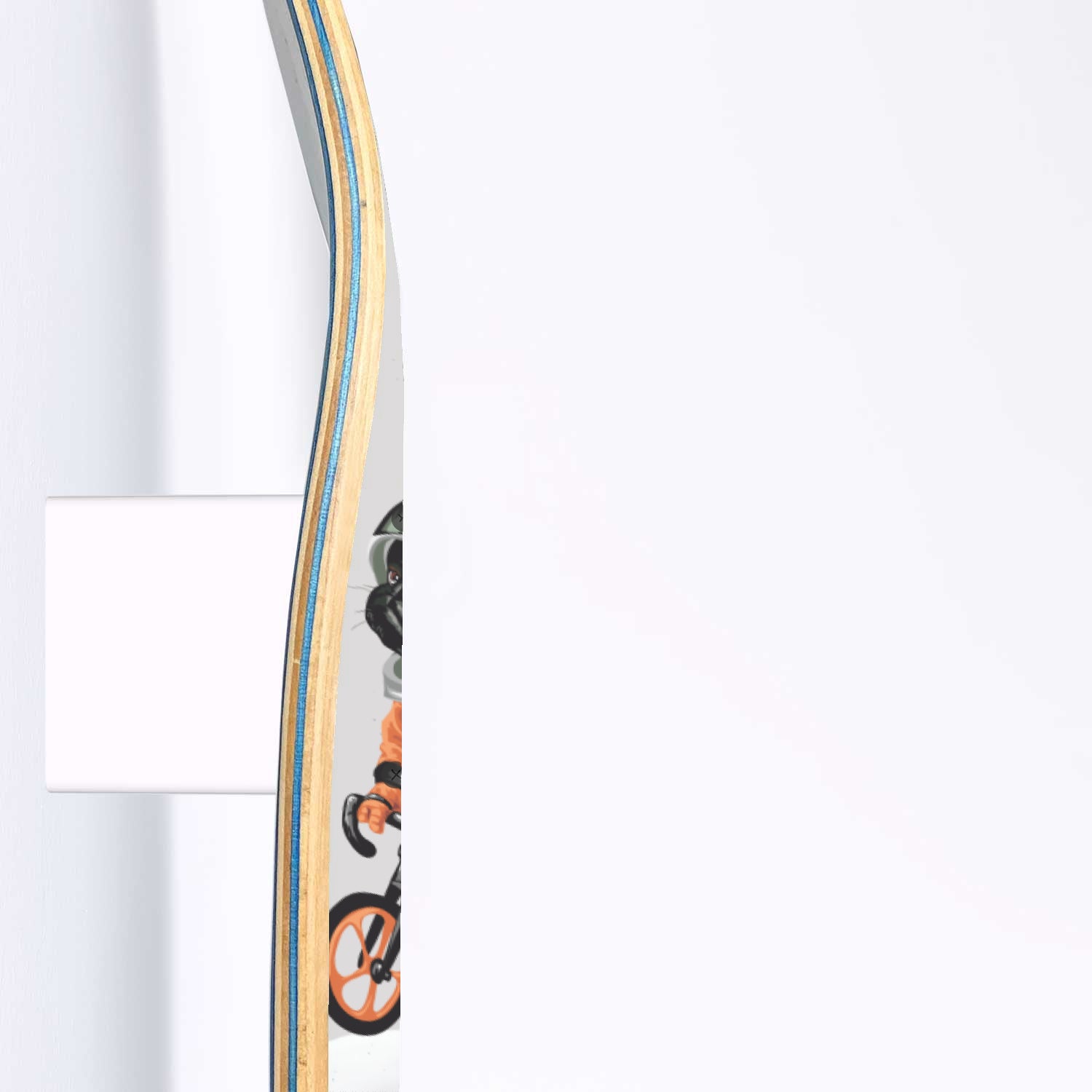 This high-quality 7-ply 100% maple skateboard is the perfect statement piece for any home or office. Custom printed graphics, one-of-a-kind art piece.